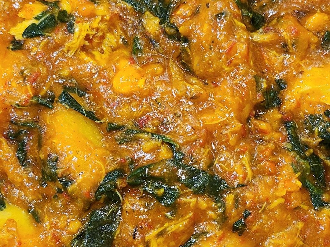 - Cover the pot and allow the contents to cook until the yam is just about soft (check by piercing with a fork or knife)